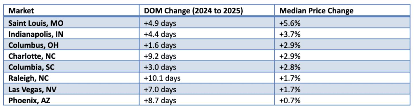 Eight of 15 markets saw median prices increase between 2024 and 2025, even as homes took longer to sell: